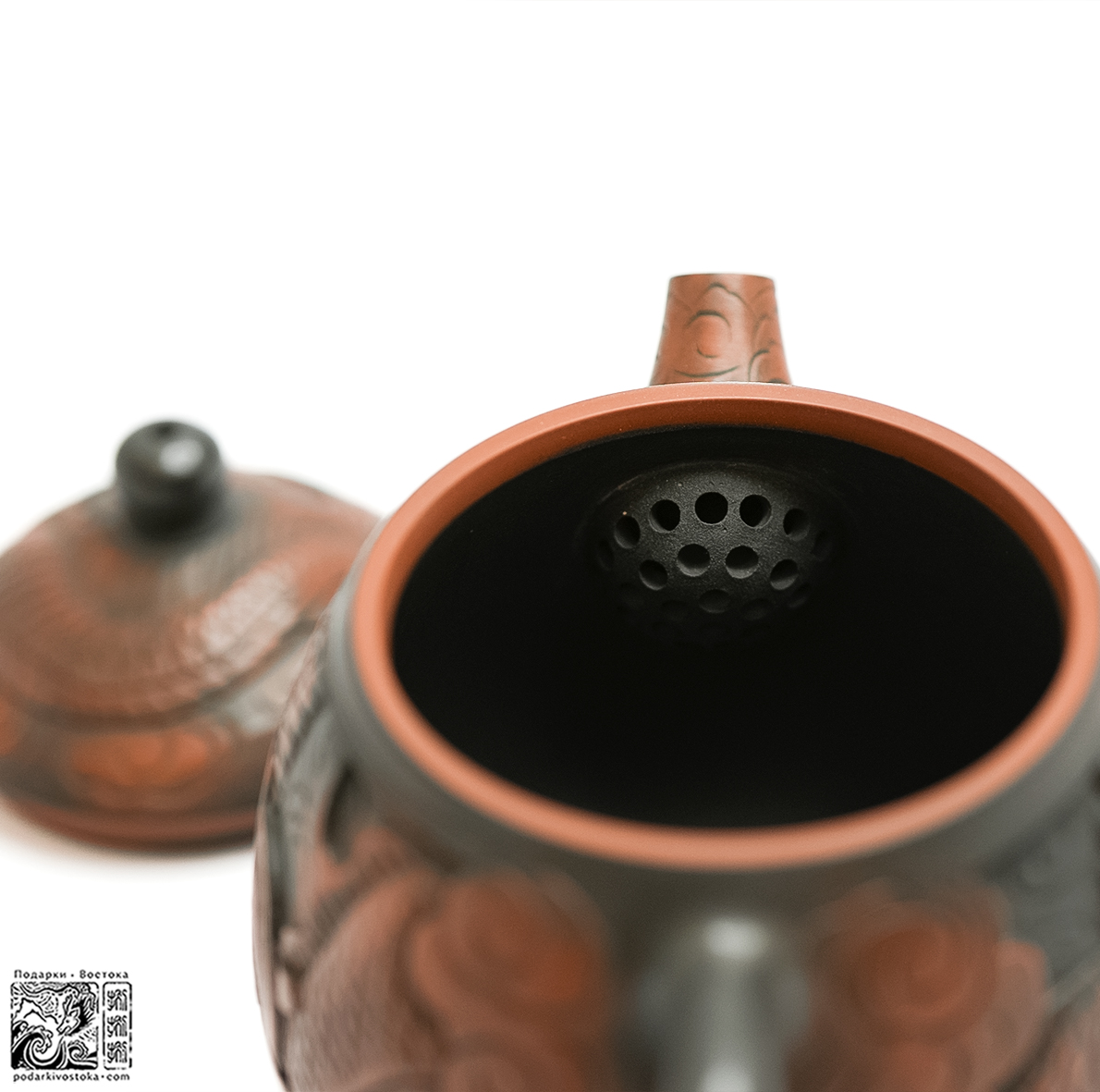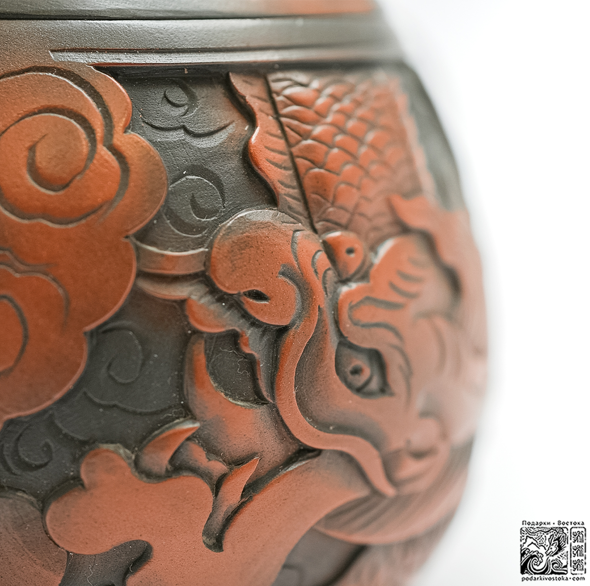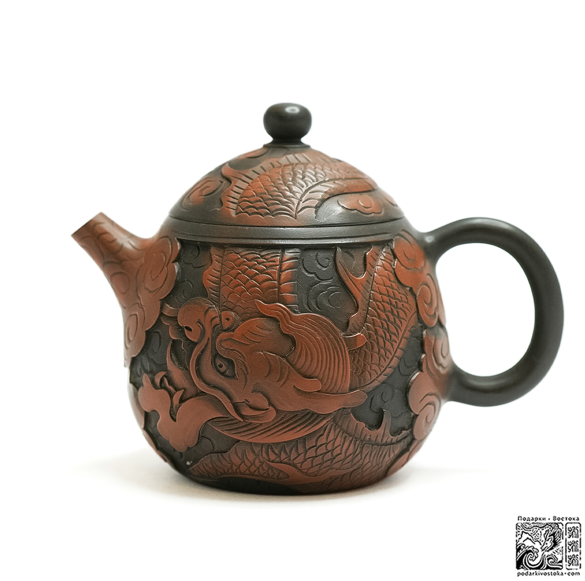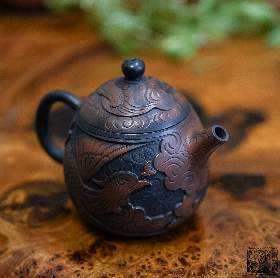 Имеет оригинальный цвет цзяньшуйской глины. Искусно выполненная резьба, украшающая поверхность чайника, посвящена двум традиционным символам китайской культуры – Дракону и Фениксу, воплощая идею о гармоничном взаимодействии двух начал.